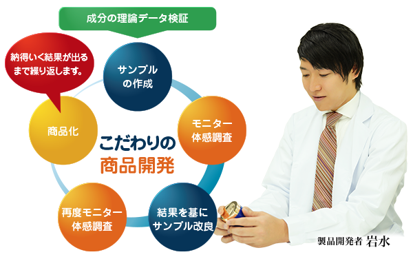 その上で、「納得いく結果」が出るまで何度もモニター調査を実施致します。そして、「本当に納得のいく結果がでた場合のみ」製品化しています。